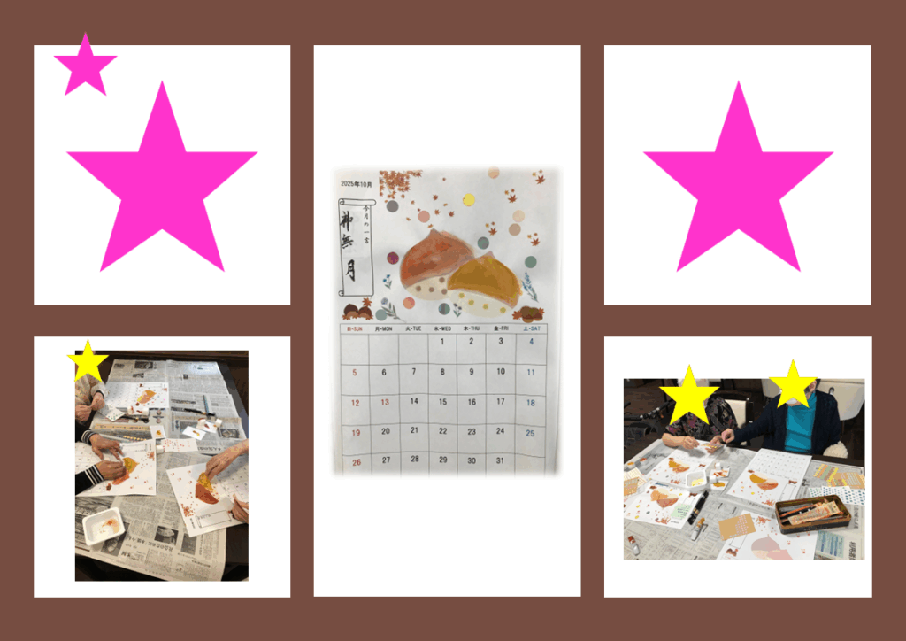 10月のカレンダーは栗のイラストのカレンダーです。イラストにスポンジで色を付けたり、シールでデコレーションをしたりしました。皆さん、ご自分の予定のある日にシールを貼ったりと工夫されていました。