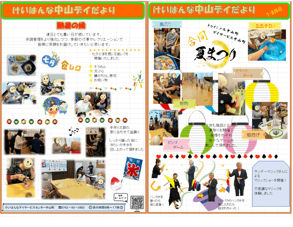 ホーム / 在宅型介護サービス / 通所介護(デイサービス) / おしらせ一覧(デイ) / おしらせ一覧() / 中山デイ便り 7・8月号